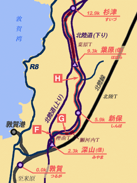 さらにぐんぐん登り、葉原の集落をすぎると無人地帯に入り、道が狭くなって廃線跡の趣が増してくる。SLの撮影名所であった葉原の大カーブ(H地点)を左に曲がると、北陸道が寄り添うようになり、やがて正面に葉原トンネルが見えてくる。